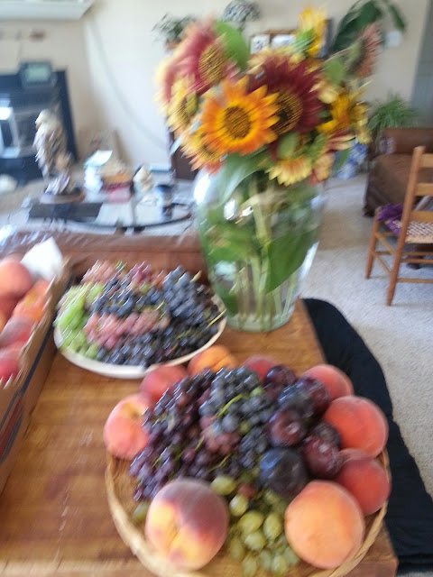 As a Master Gardener, I was invited to volunteer at our booth at the Pomology field Day today. It was spectacular. Dr. Essie Fallahi and his team gave talks about growing fruits and irrigation as well as pest managment and disease control. There were tables and tables and tables of baskets full of many varieties of peaches, apples, plums, nectarines,grapes, pears,as well as walnuts and almonds. After the presentations were over with there were tours of the growing fields. And in all Idaho generosity, the fruits were given away. People were liading cases after cases . The team handed out large garbadge bags ... with my having a heads up that fruits would be given away, I brought my own bags. I loaded up on enough concord grapes to make two batches of grape jelly, and a ton of peaches for preserves, jams and cobbler. Not to mention enough to nibble on while fresh. I was also lucky enough to grab sone juicy nectarines. By the time I got to the appkes, they were gone.... but then I was tokd the appkes were in cold storage fir a year... this seadons apples haven't been picked just yet. So itceas a beautiful day up on a idaho hilltop, with people thst love fresh fruit. Yummy...